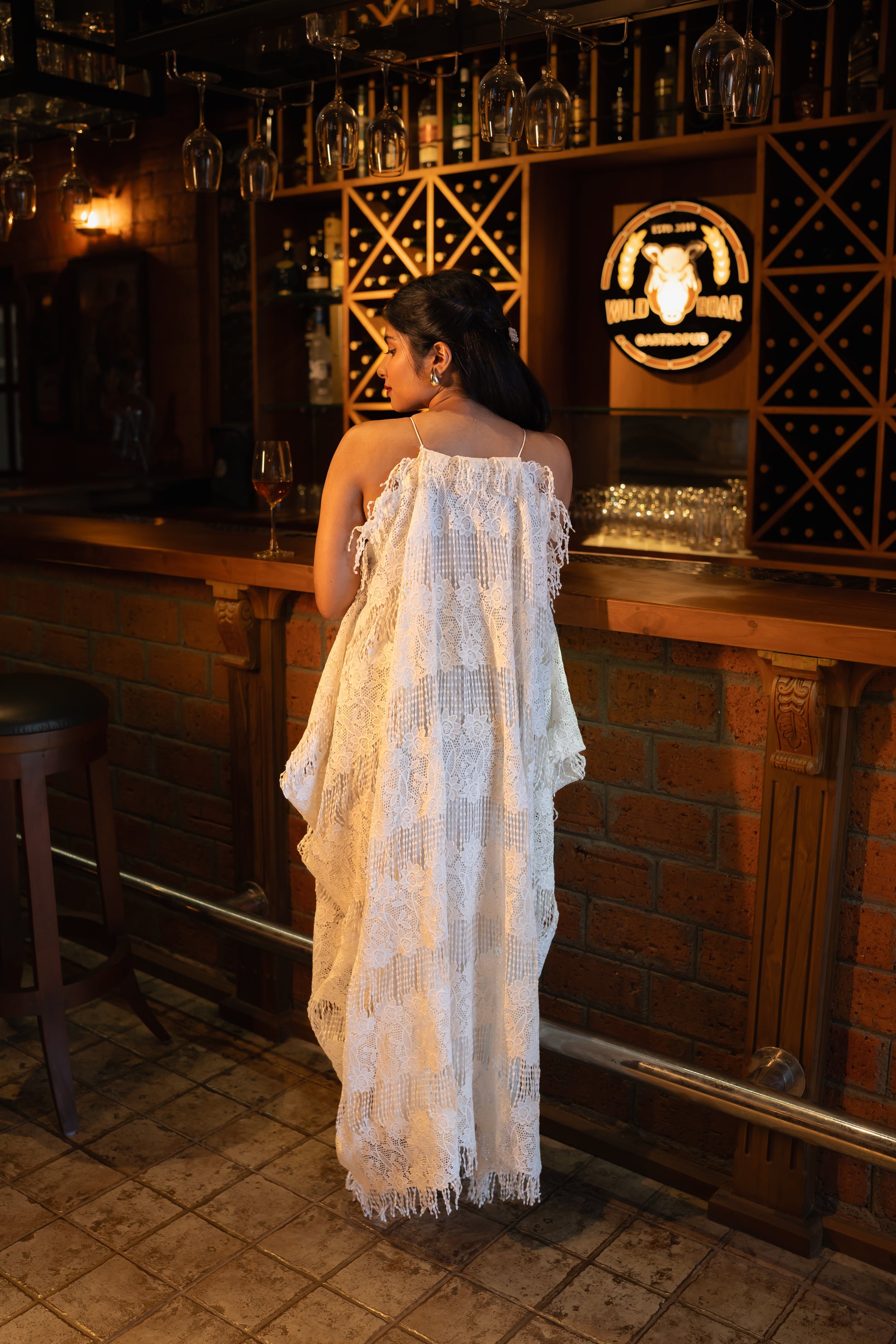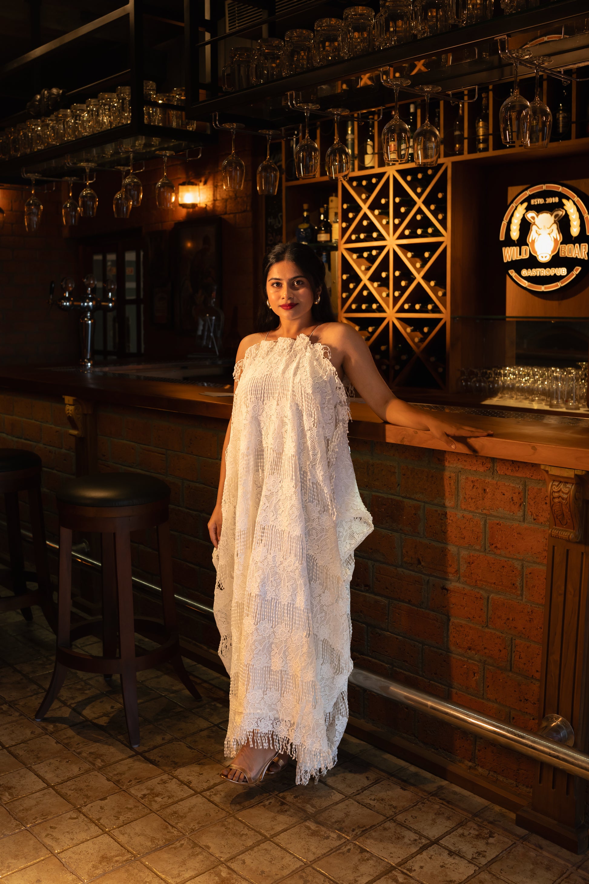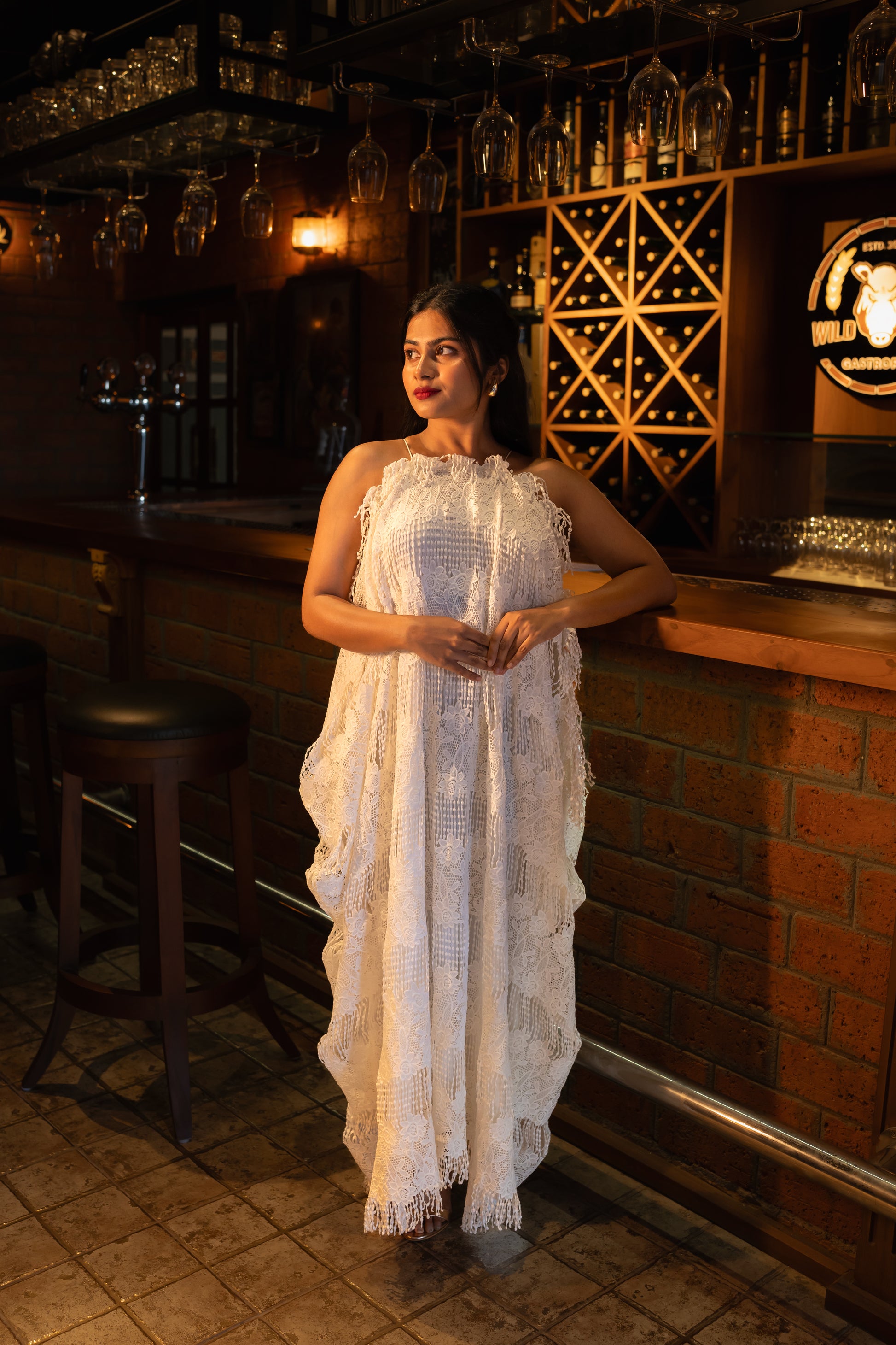 A stylish halter neck dress with fringe lace detailing, offering a playful and sophisticated touch. Its relaxed kaftan fit ensures comfort while exuding effortless charm for any occasion.