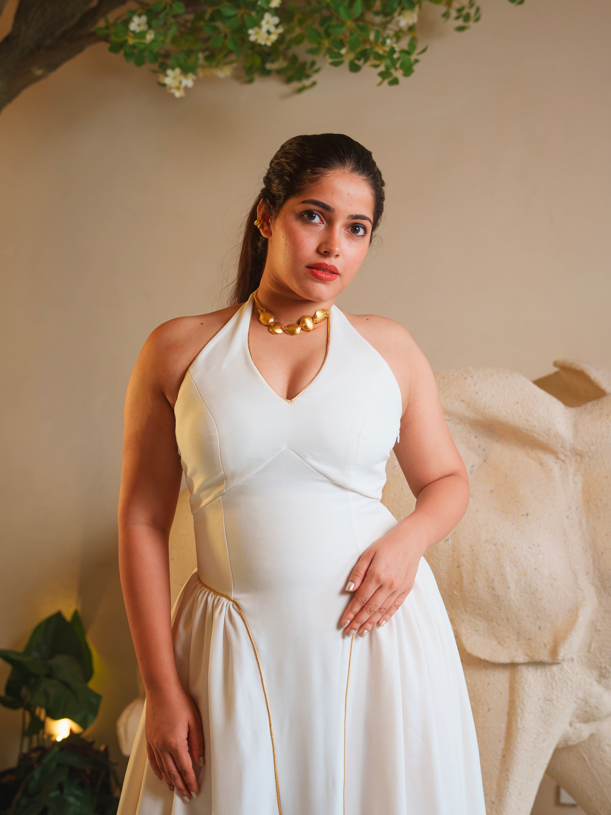 A modern white midi dress crafted for understated sophistication. The halter neckline ties at the back with a hint of gold accent, adding a festive yet minimal touch. The bodice features clean lines that flow into a panelled skirt, enhanced with fine gold piping along the seams to elongate the silhouette. Side gathers create gentle volume, ensuring movement and comfort.